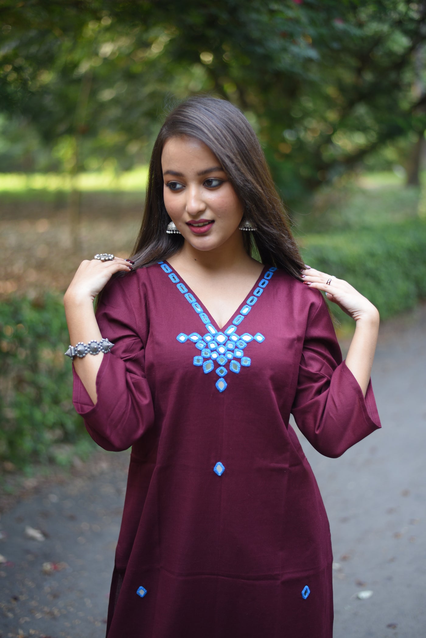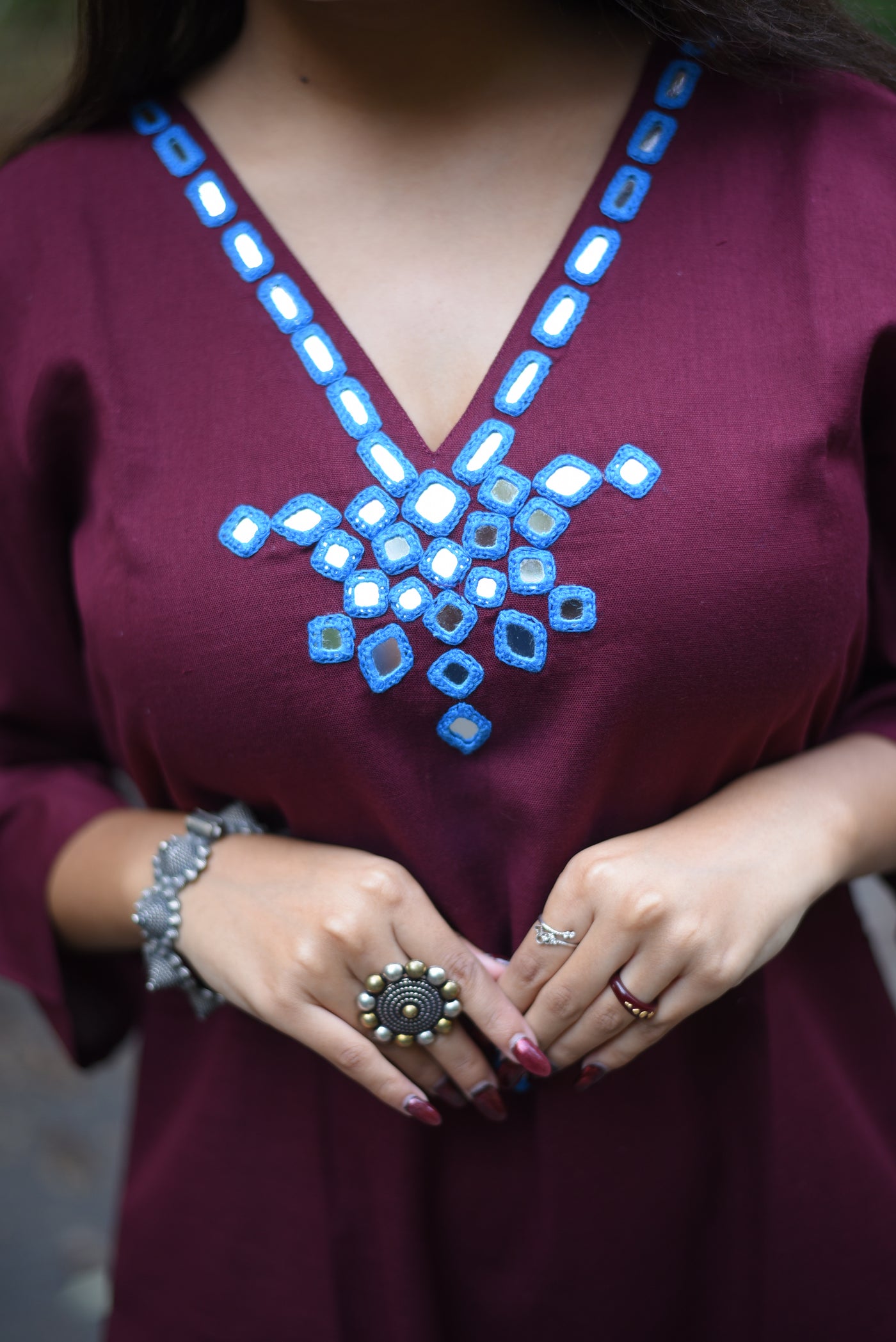 Maroon Mirror Hand Embroidery Work Cotton Kurta