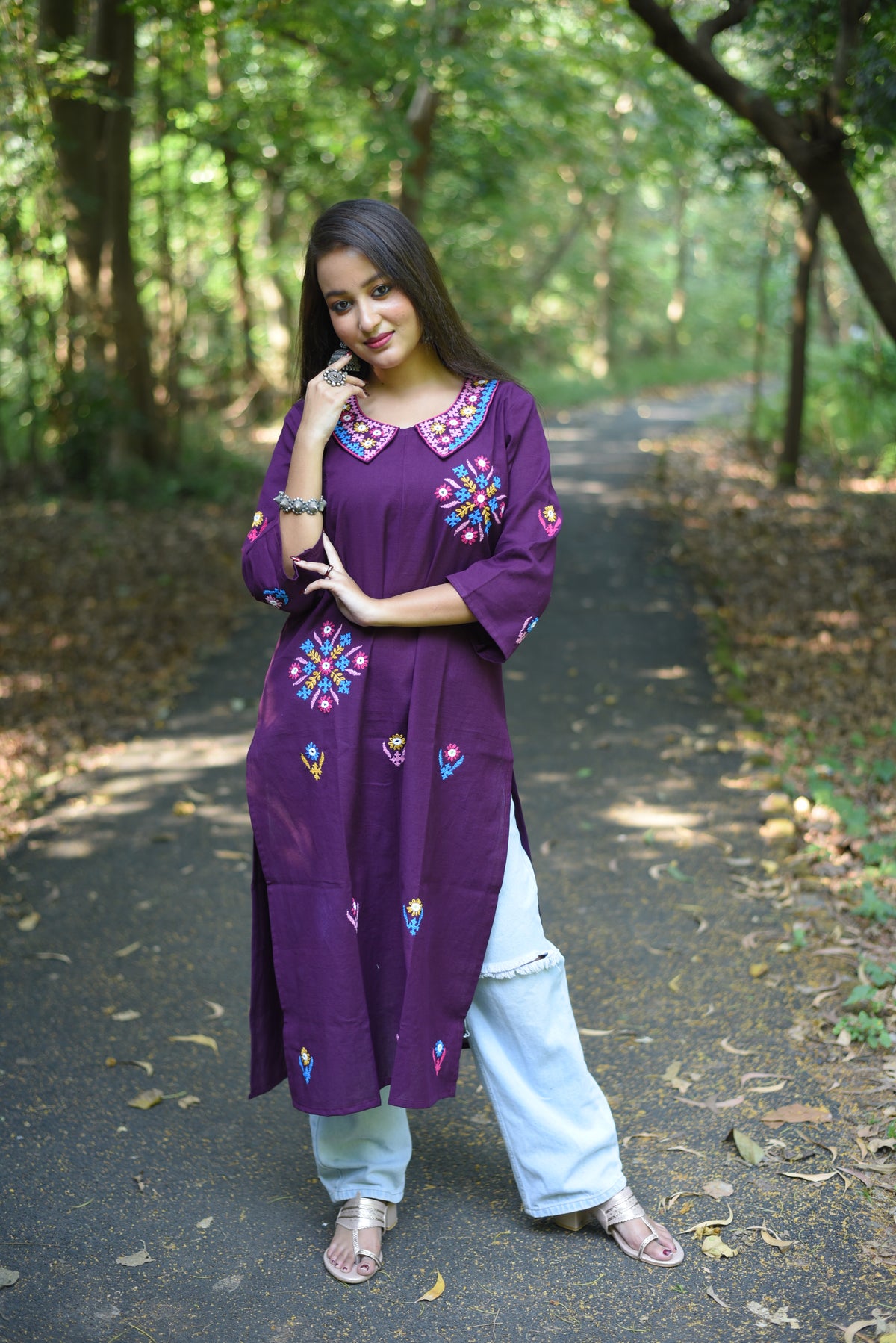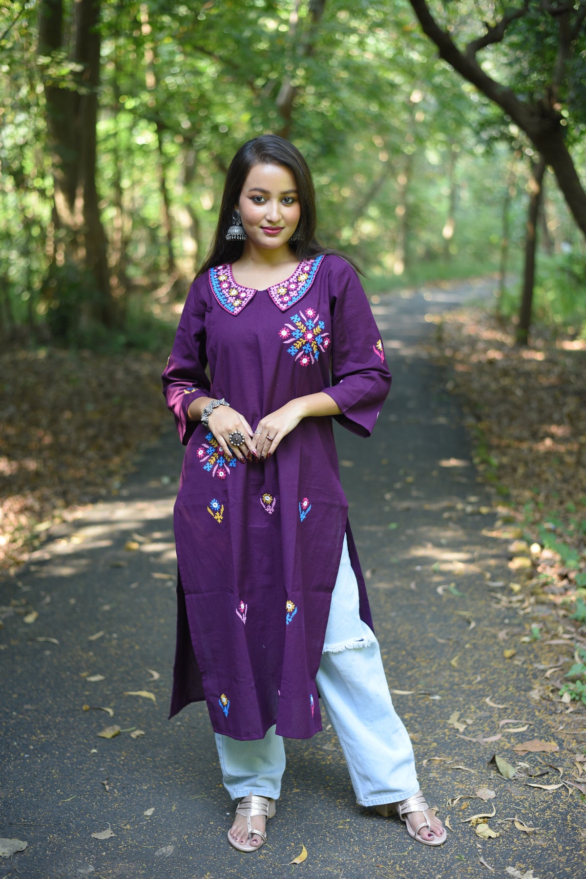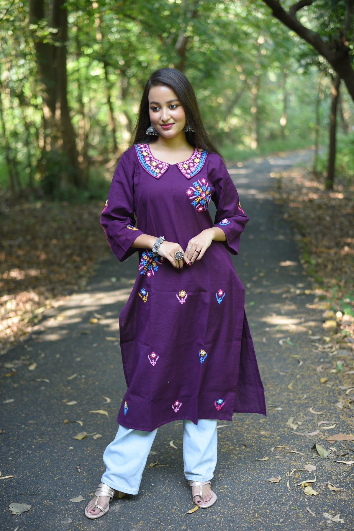 Elevate your ethnic wardrobe with this exquisite plum-hued kurta, meticulously crafted from premium cotton. Each piece showcases authentic hand-executed Kutch embroidery—a centuries-old textile art form renowned for its intricate geometric patterns and vibrant detailing. The breathable cotton fabric ensures comfort throughout the day, while the rich plum tone offers versatile styling options for both casual gatherings and festive occasions. Perfect for those who appreciate traditional craftsmanship blended with contemporary silhouettes, this kurta is a timeless addition to your collection.