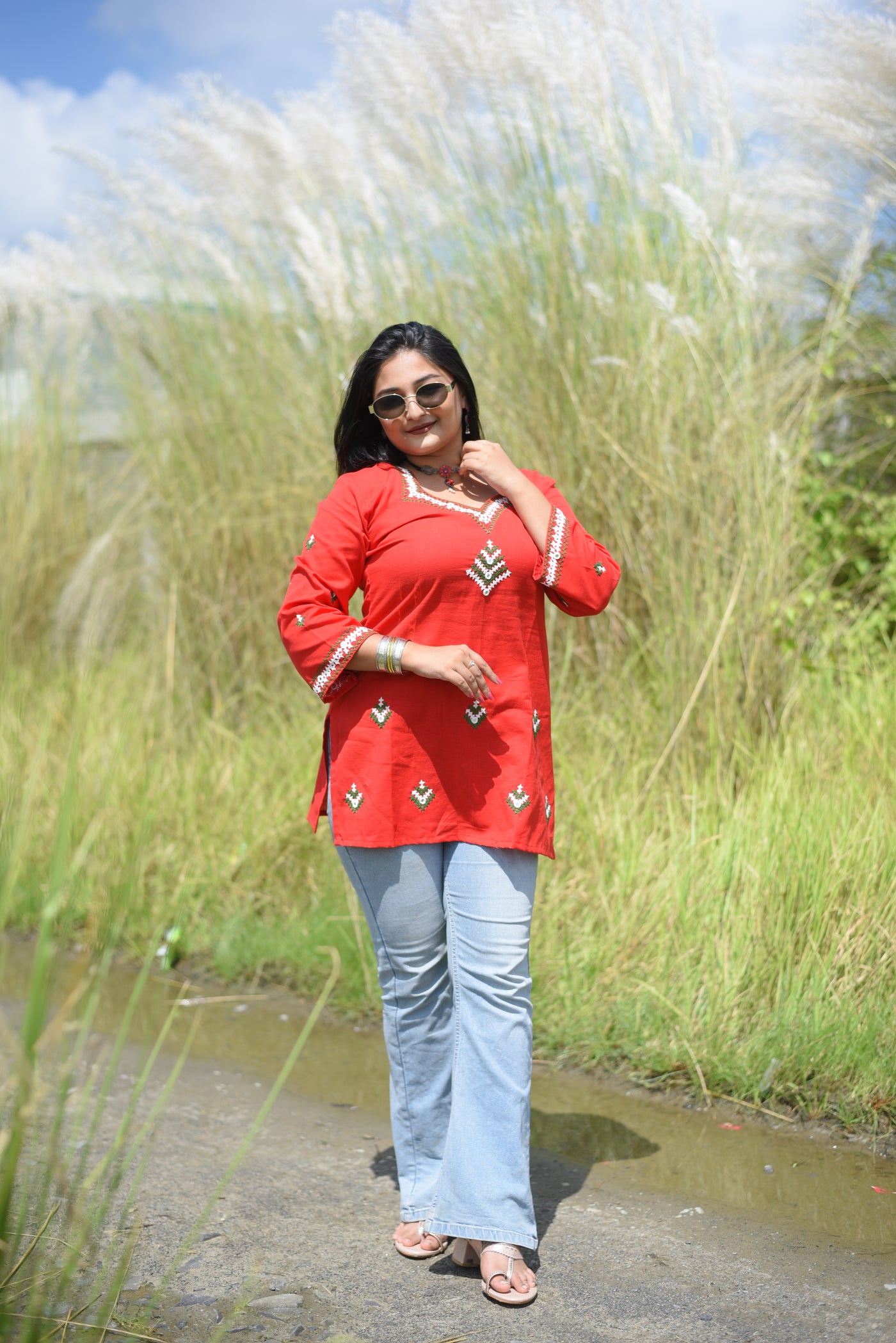 Red Hand Embroidered Kutch Work Short Kurti - XS