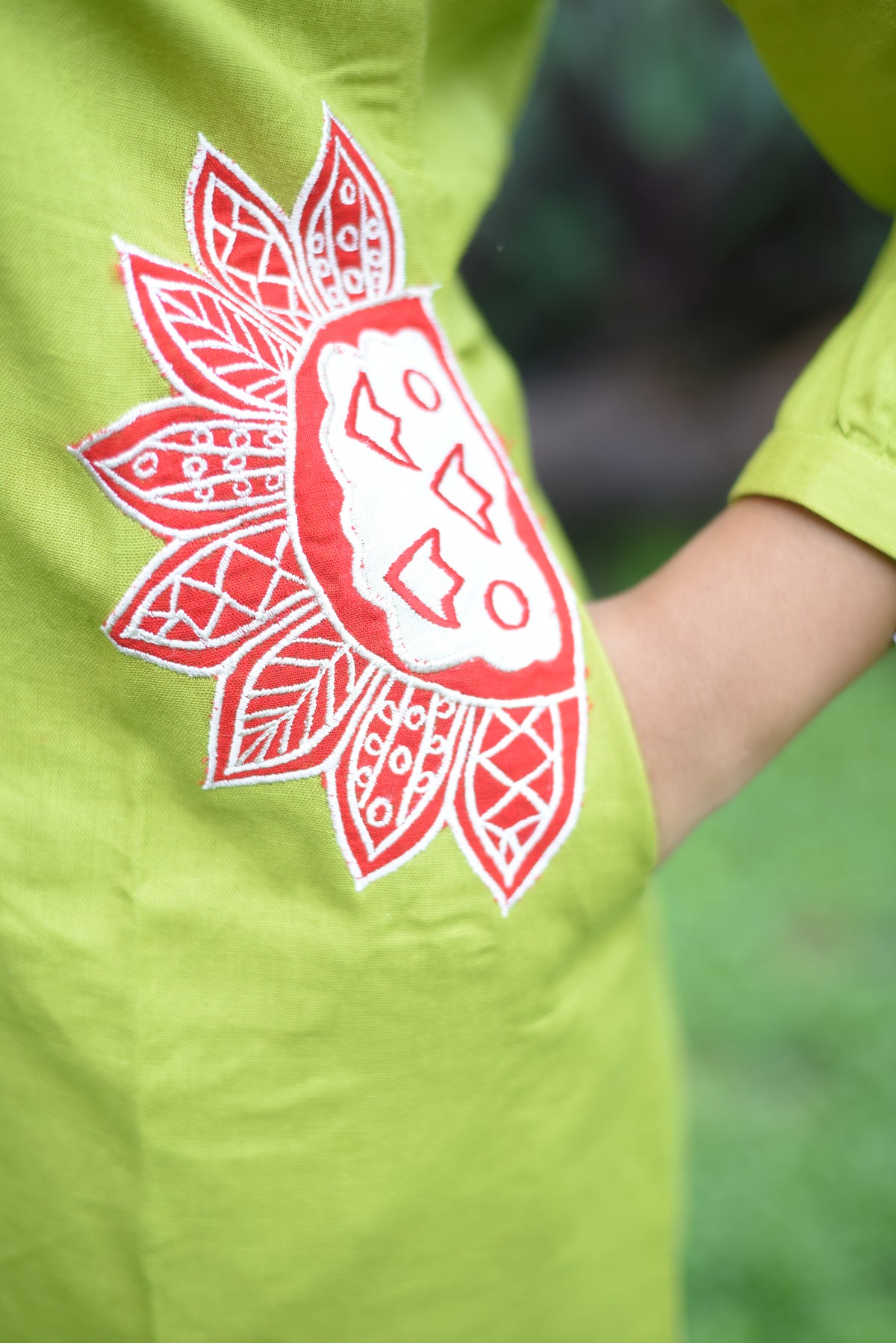 Crafted from breathable cotton, this green applique midi dress combines comfort with refined detail. Its intricate applique work adds texture and sophistication, making it ideal for both casual and semi-formal occasions. The midi length offers a balanced silhouette, ensuring ease of movement without compromising elegance. Perfect for those seeking a stylish yet practical addition to their wardrobe.